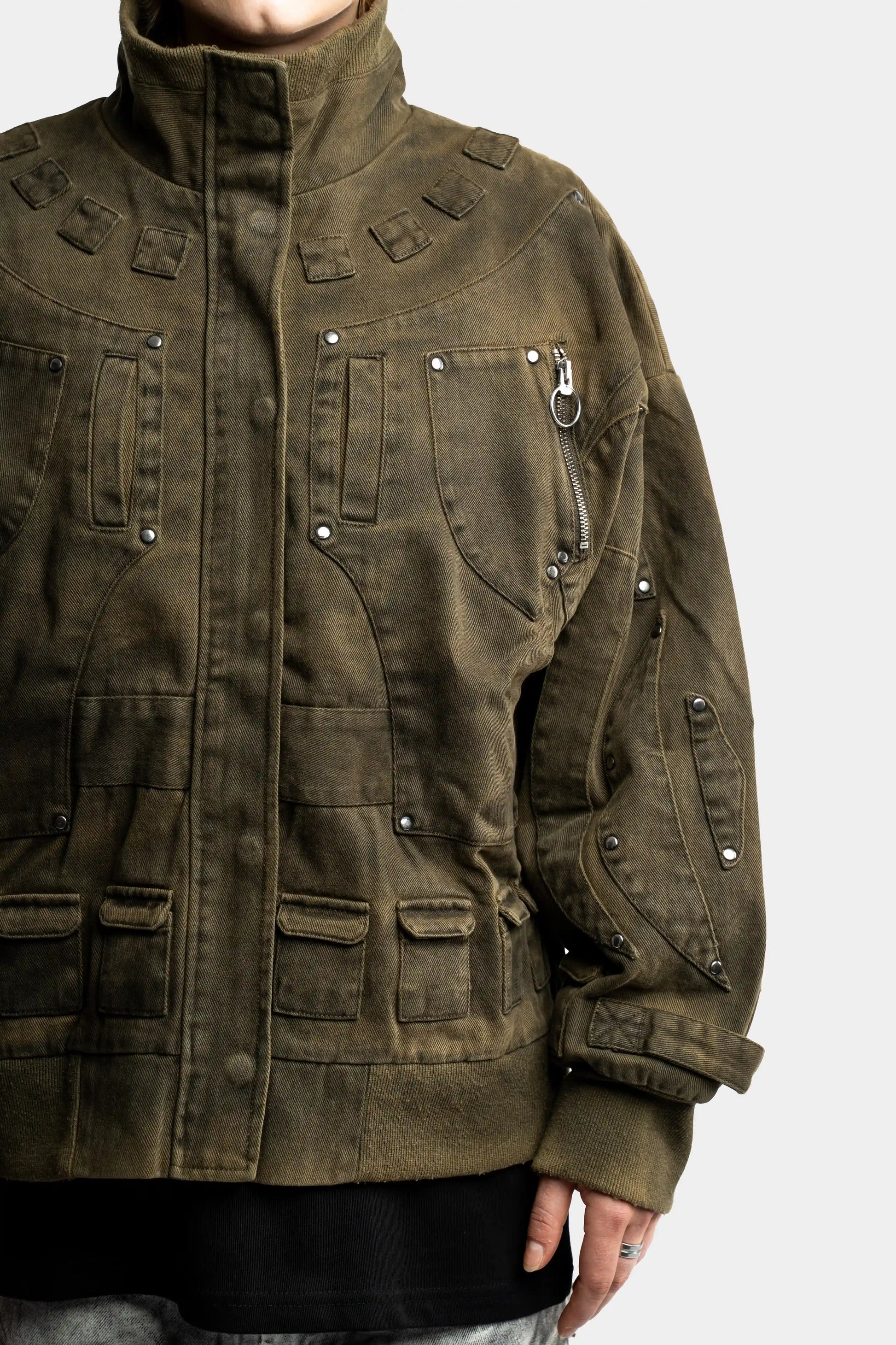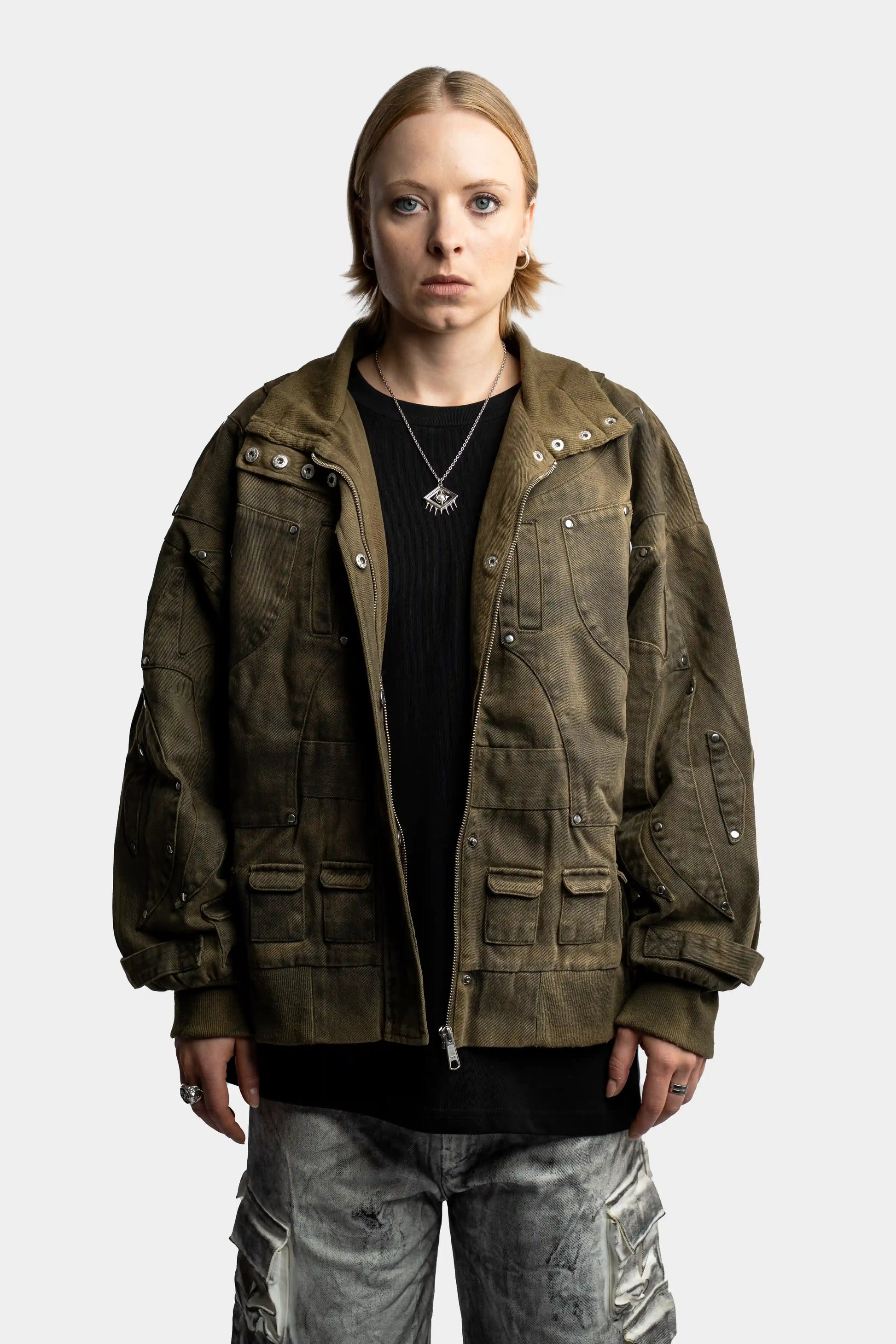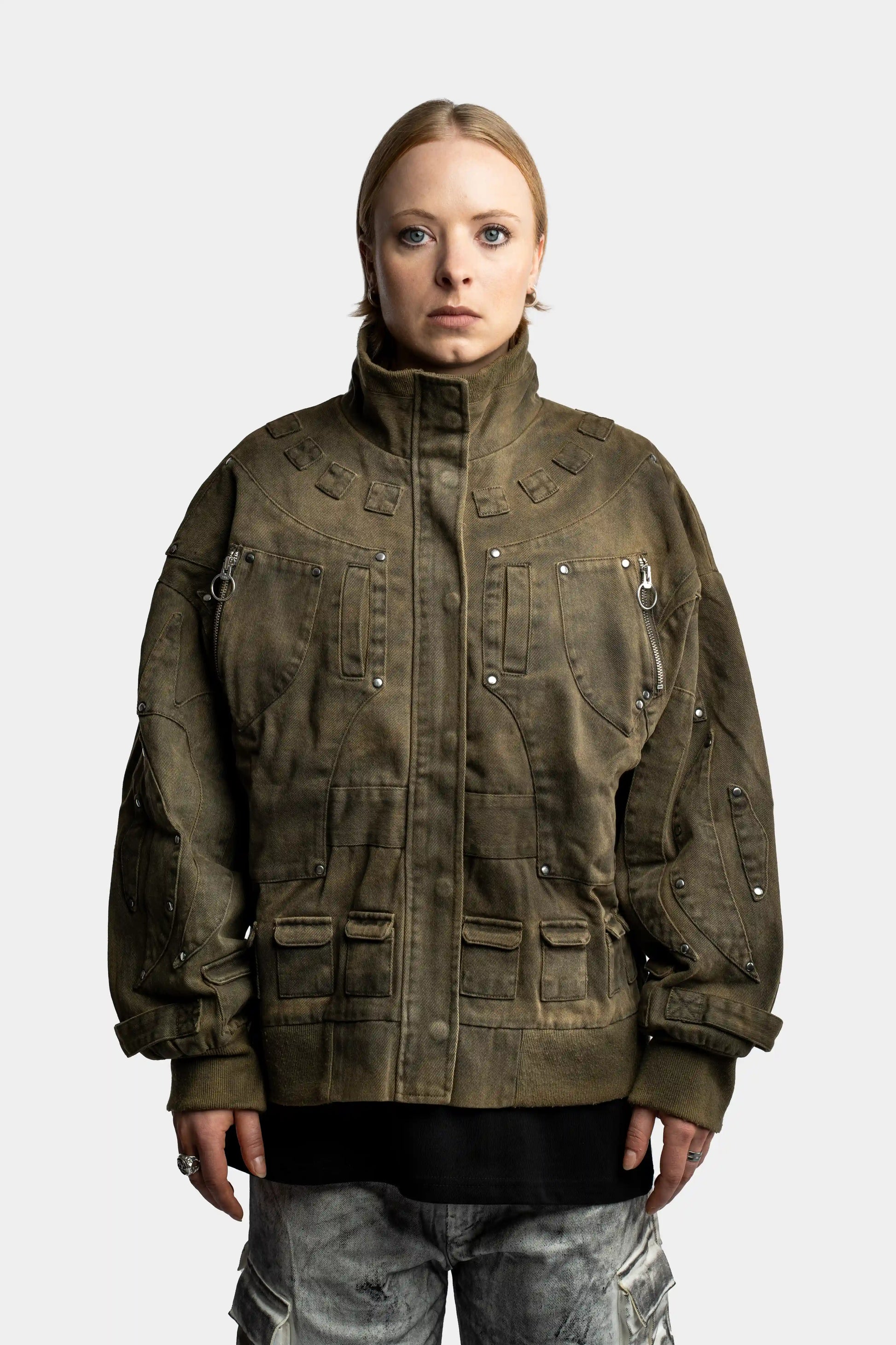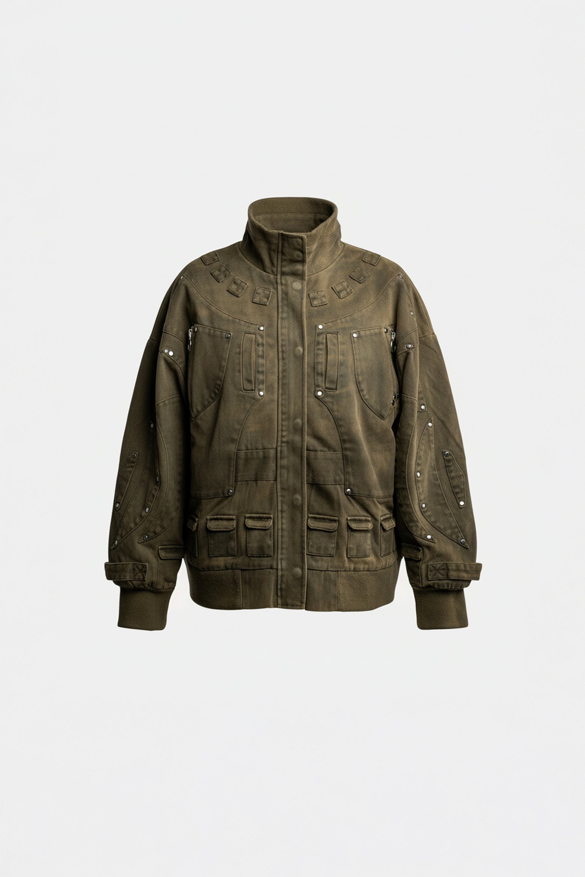 Heavy cotton-canvas bomber with paneled details and multiple pockets.