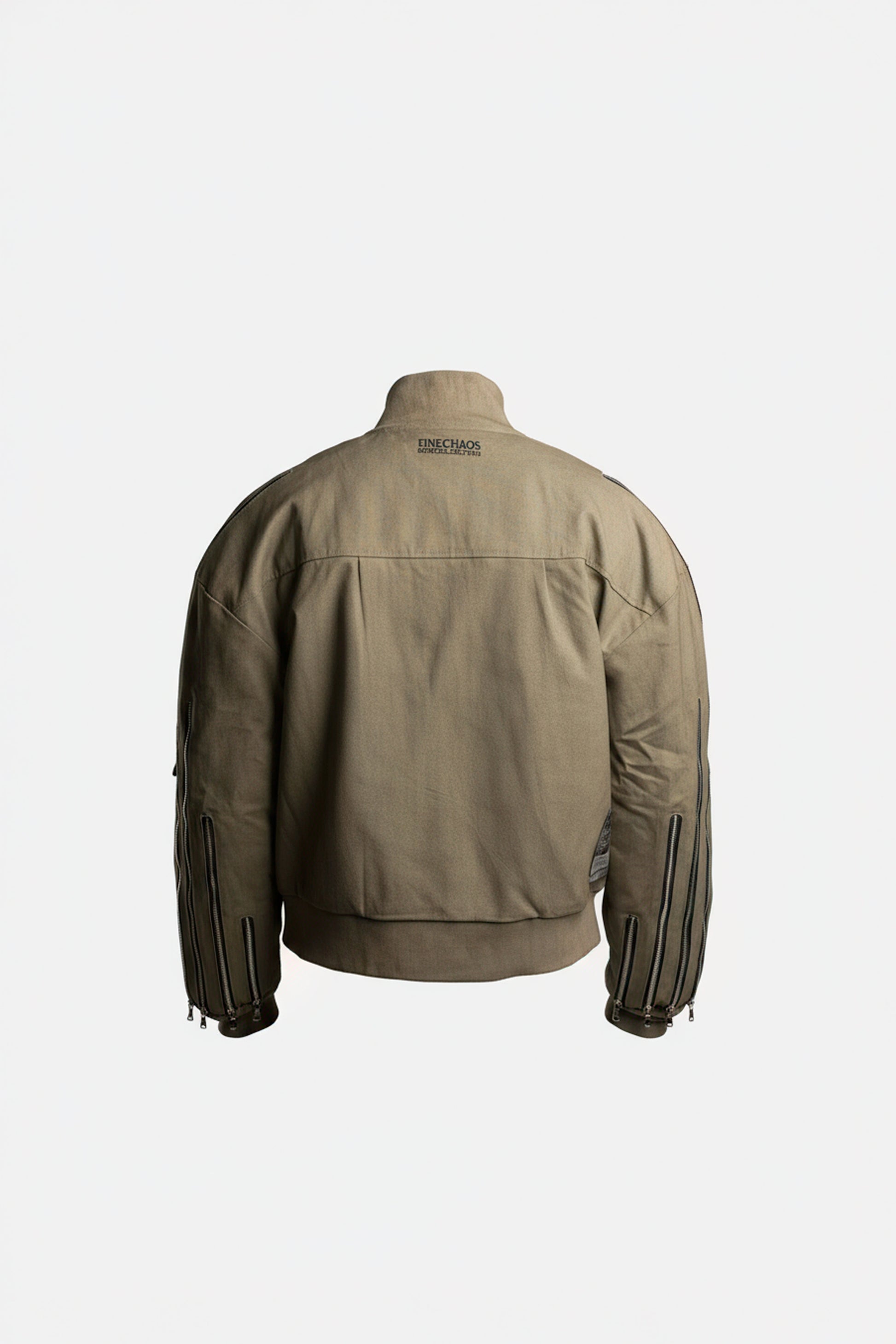Cotton-canvas bomber with functional zipper panels and rib details.