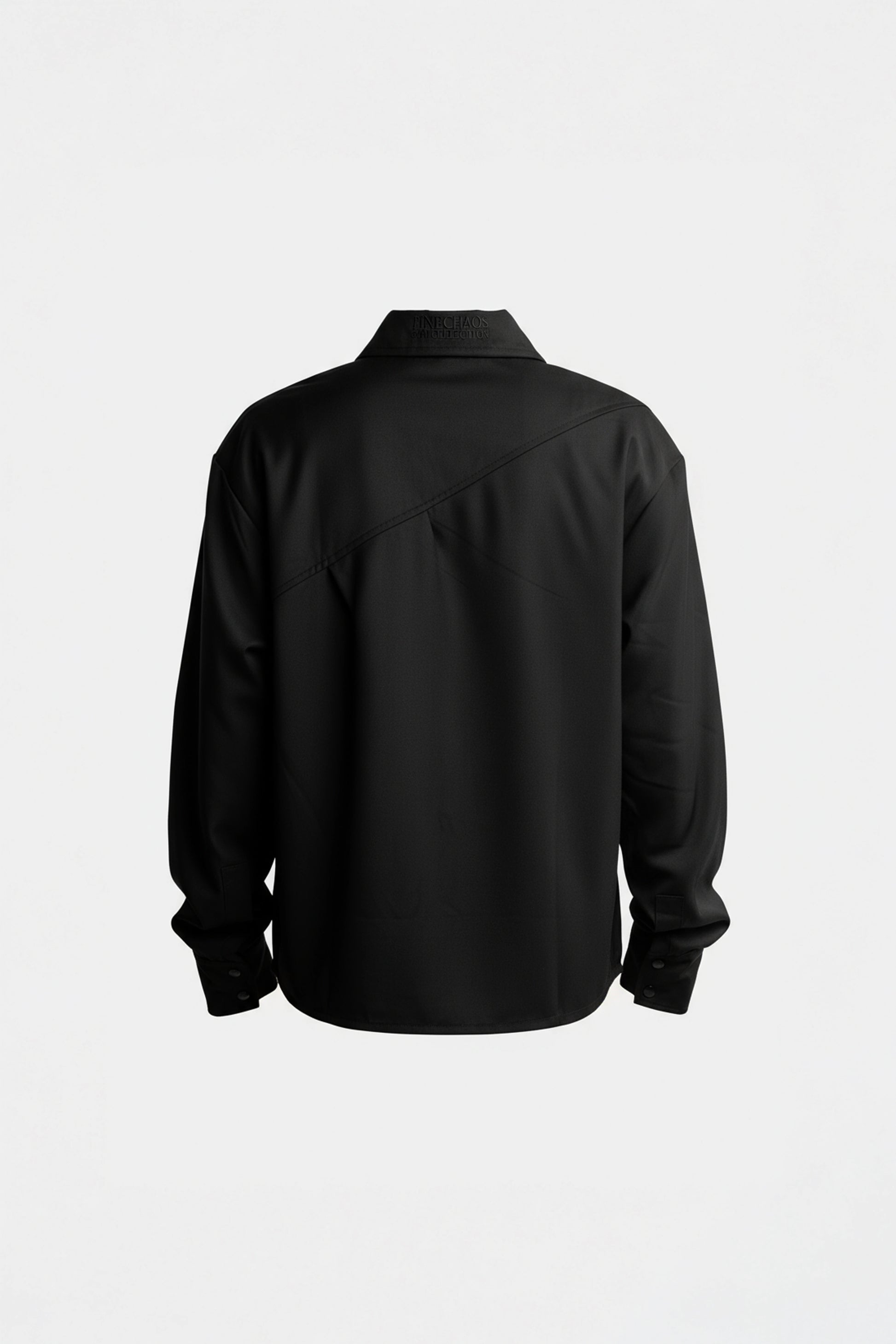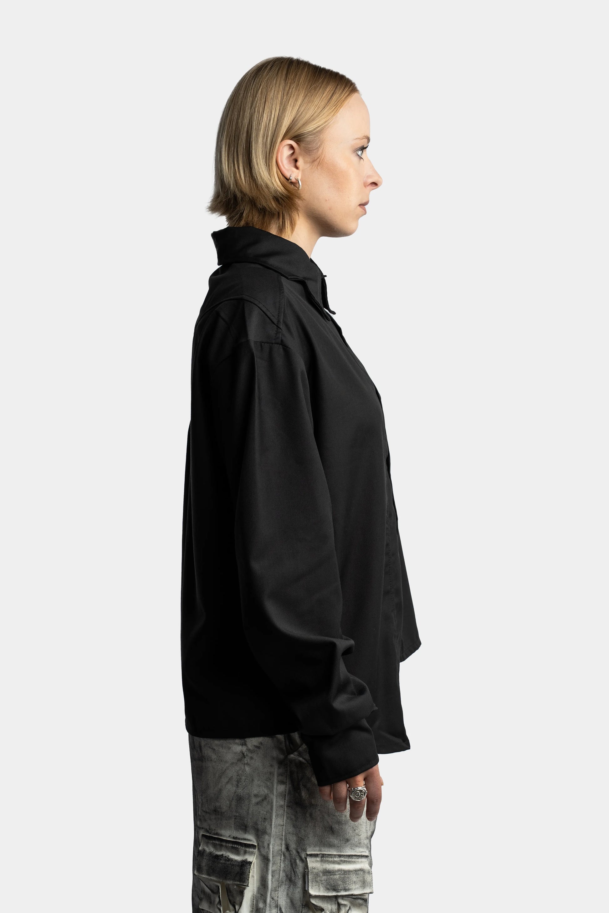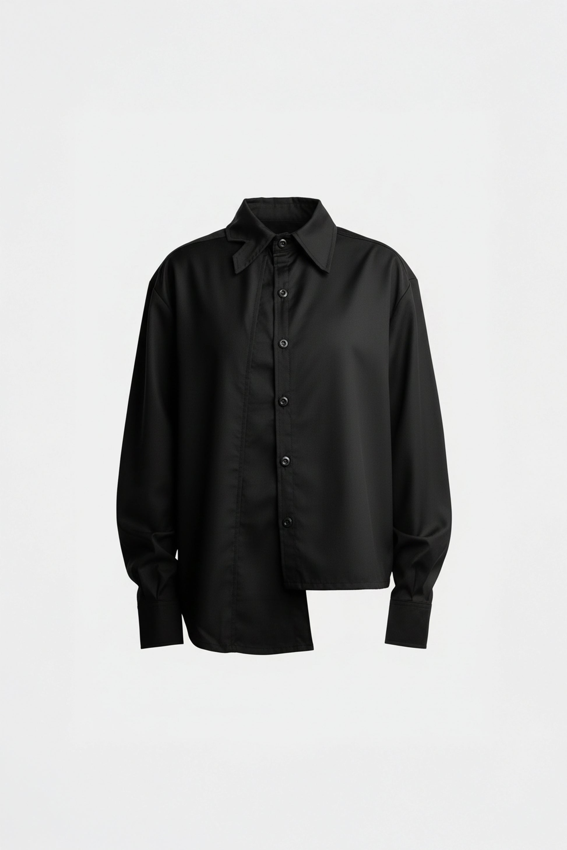 Fine wool shirt with asymmetrical opening and shoulder piece.