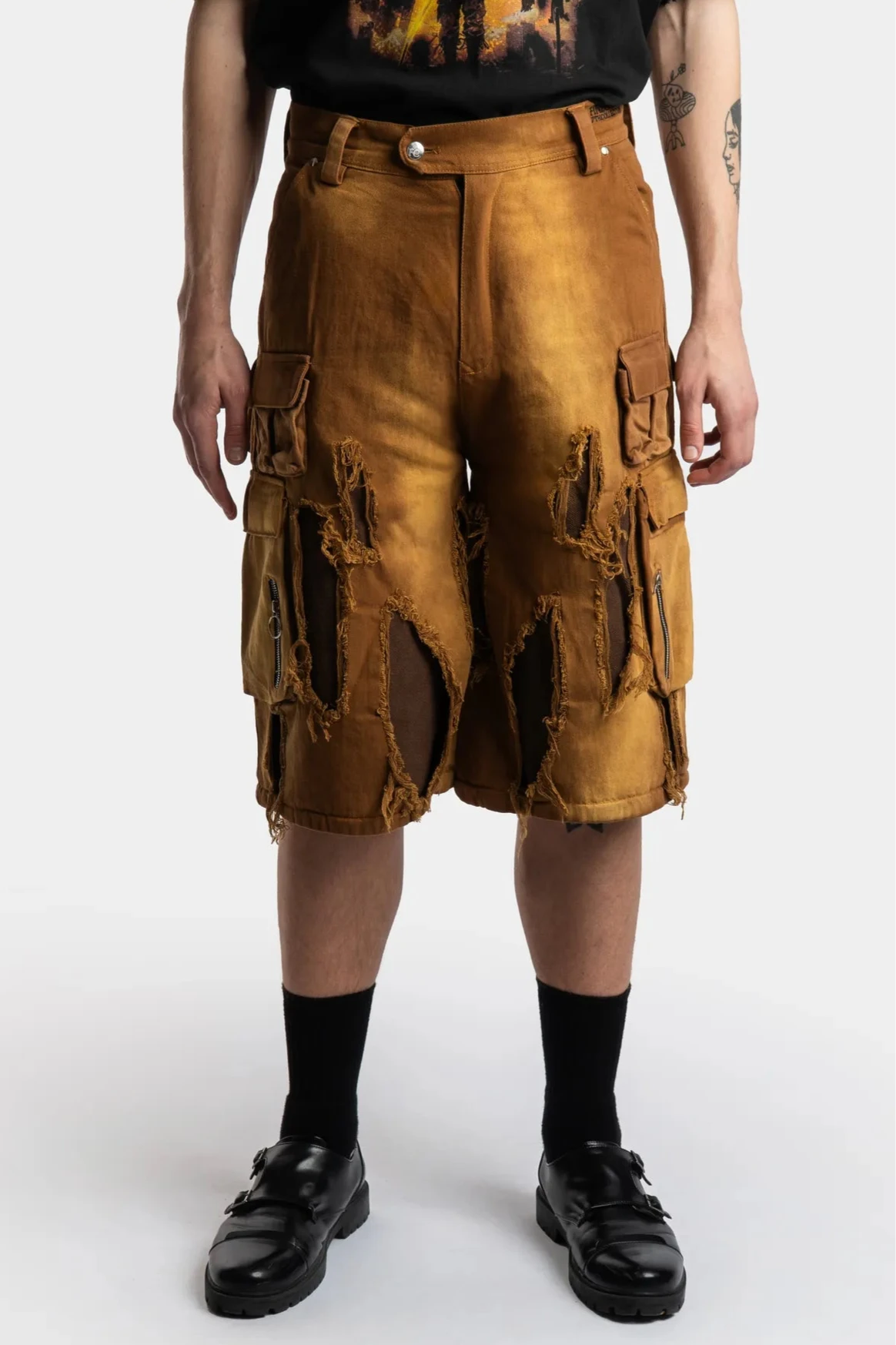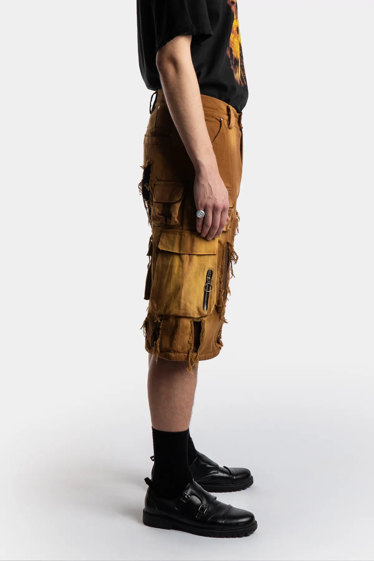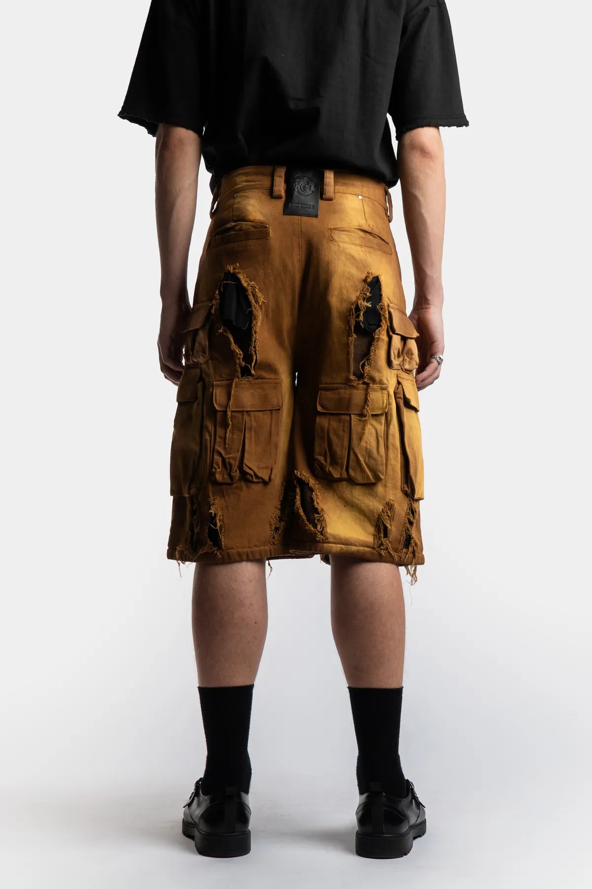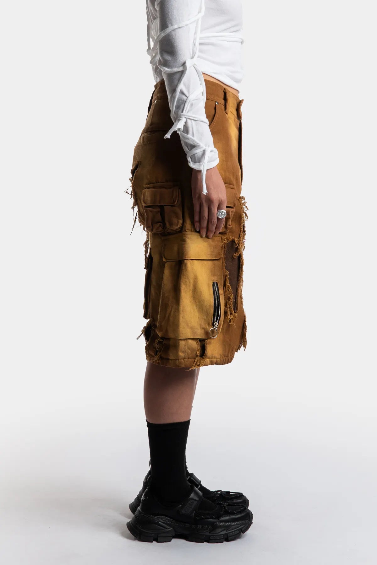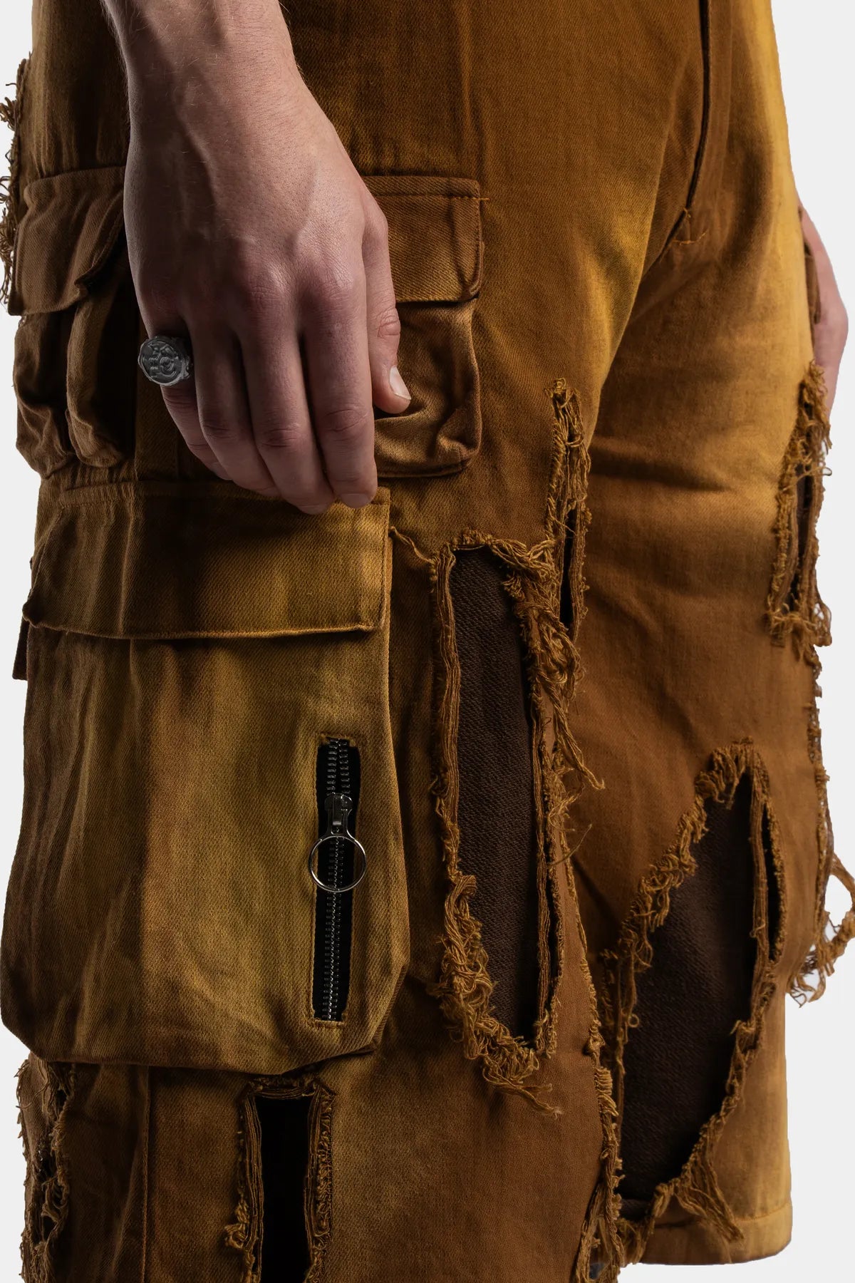 Double-layered cargo shorts in organic cotton canvas and jersey featuring multiple pockets, washed effect, and relaxed 3/4 length.