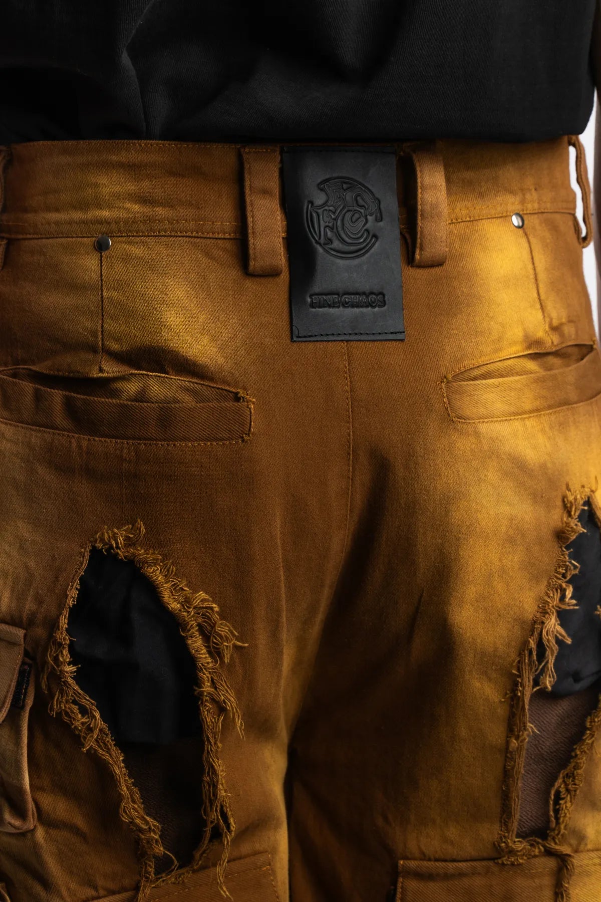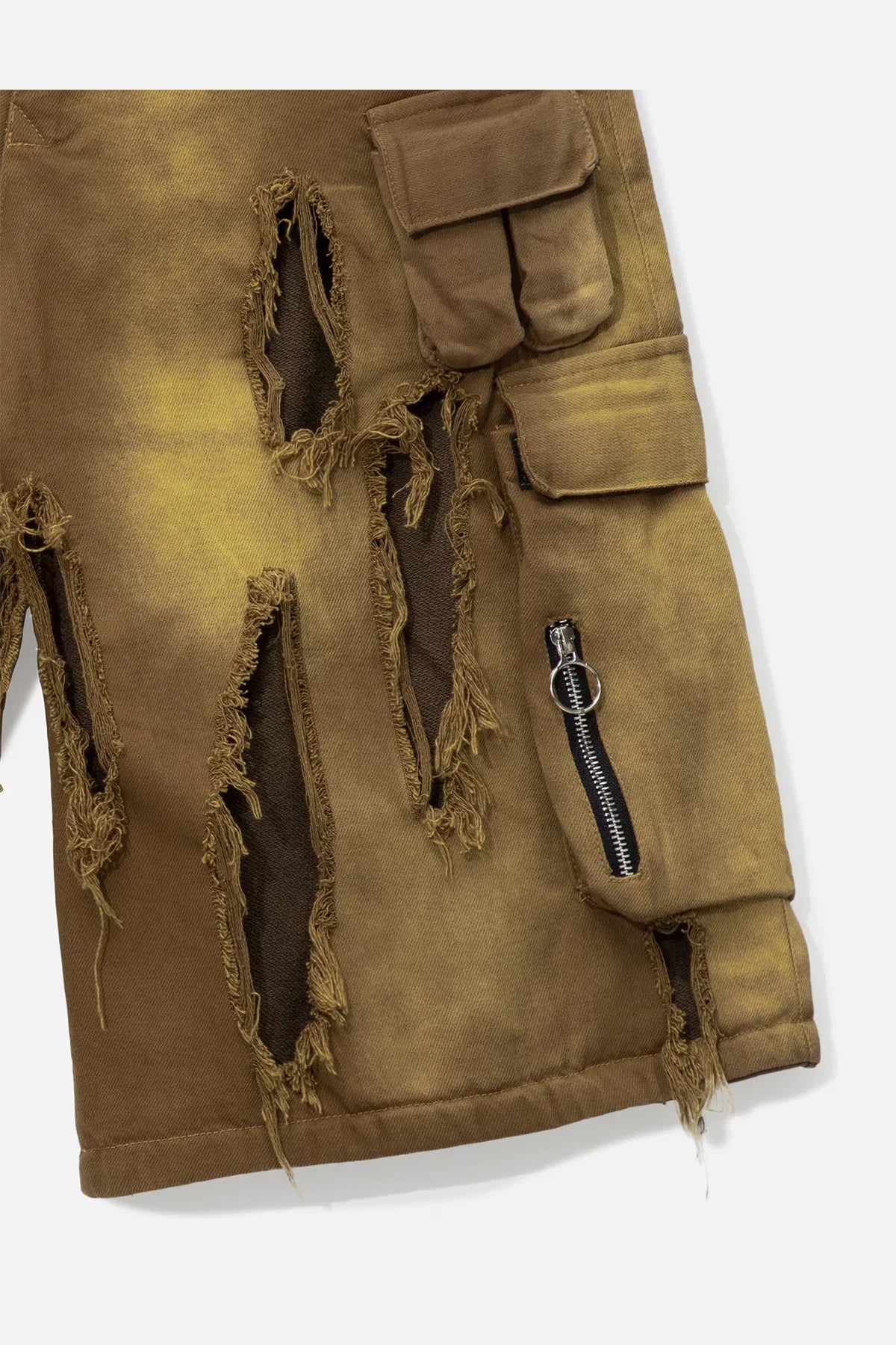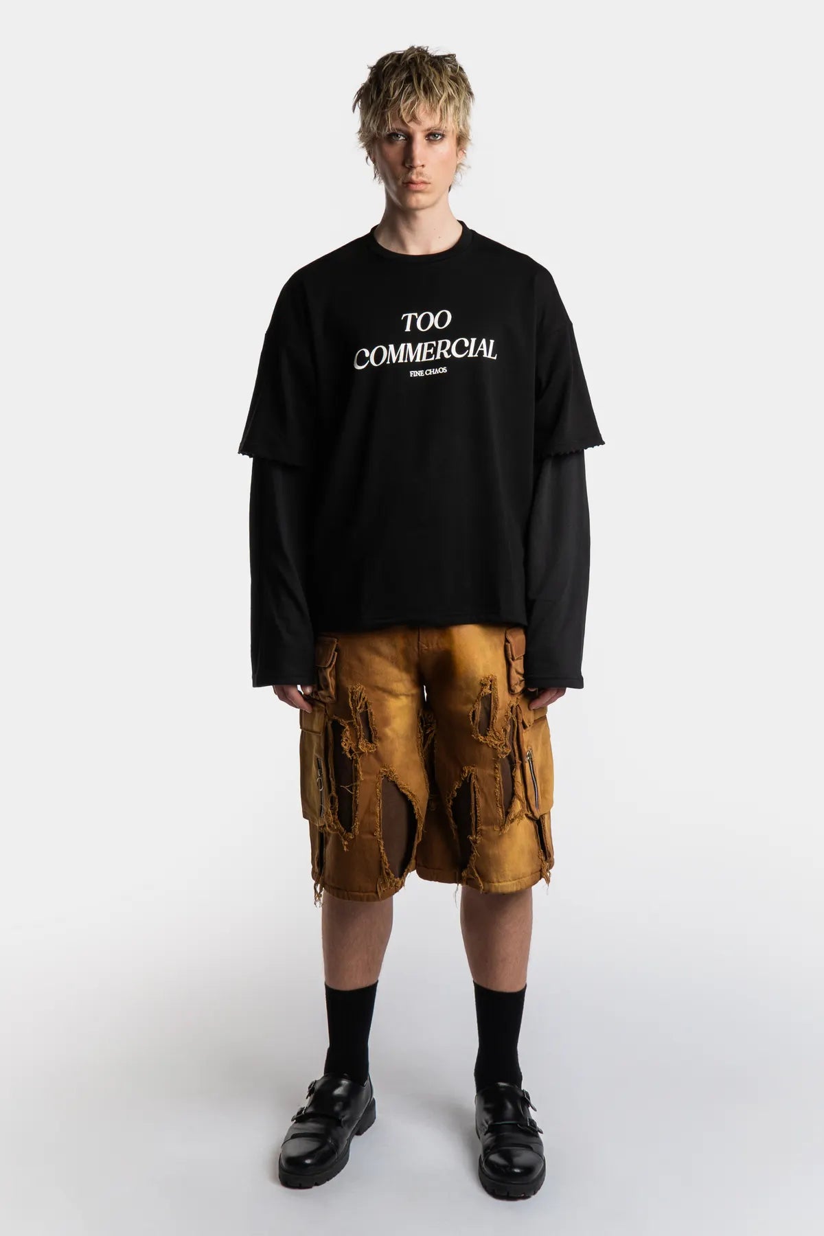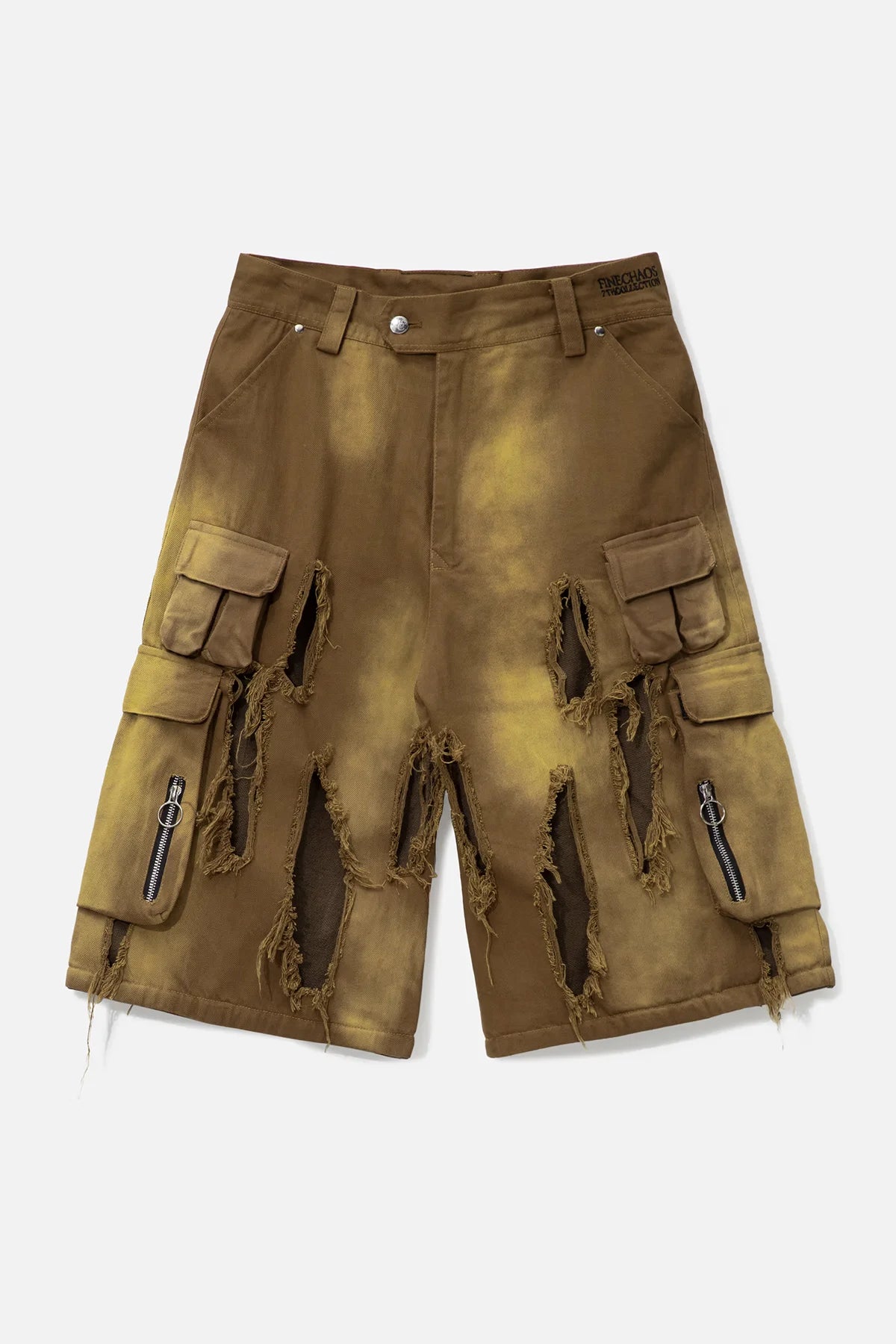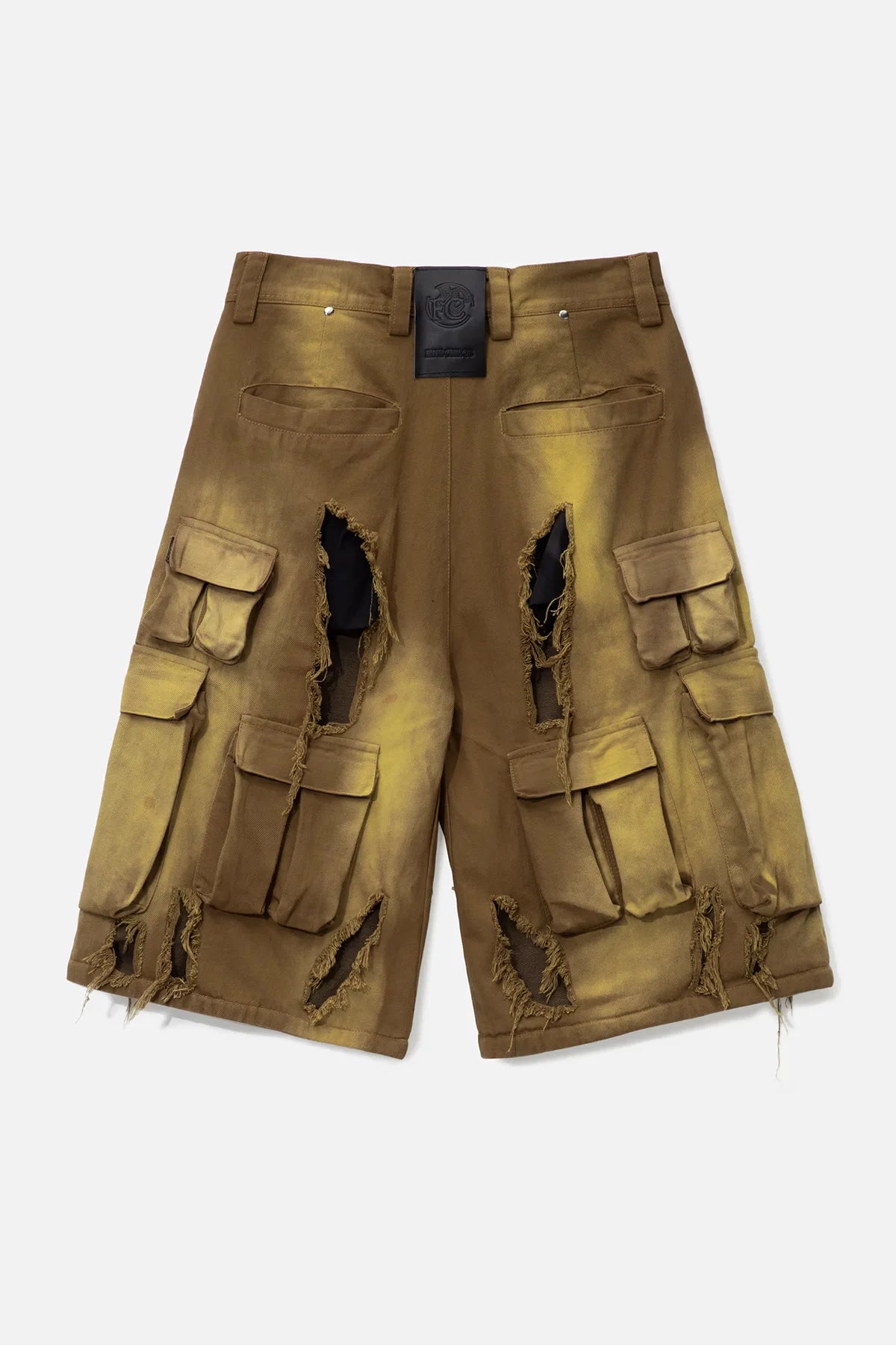 Double-layered cargo shorts in organic cotton canvas and jersey featuring multiple pockets, washed effect, and relaxed 3/4 length.