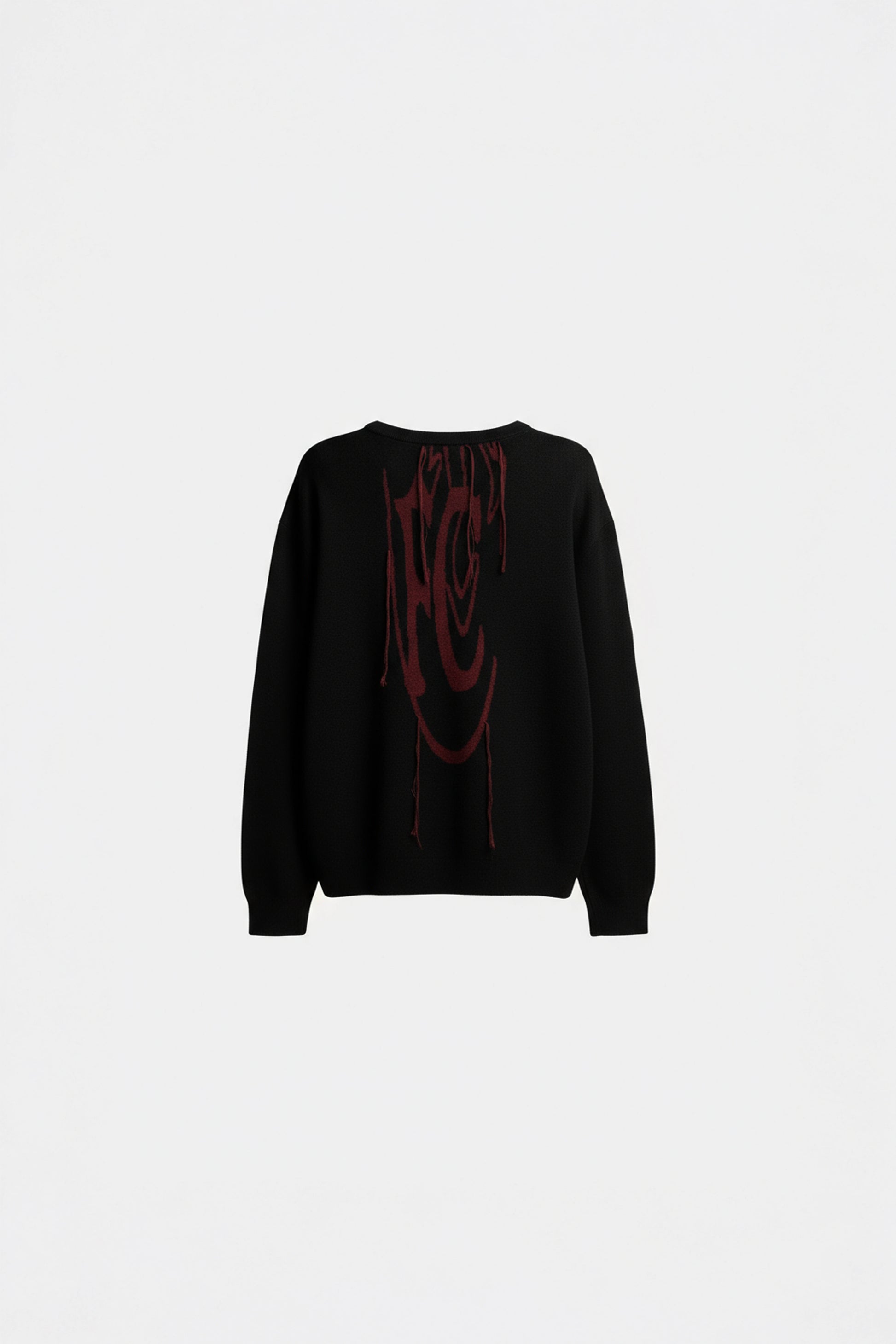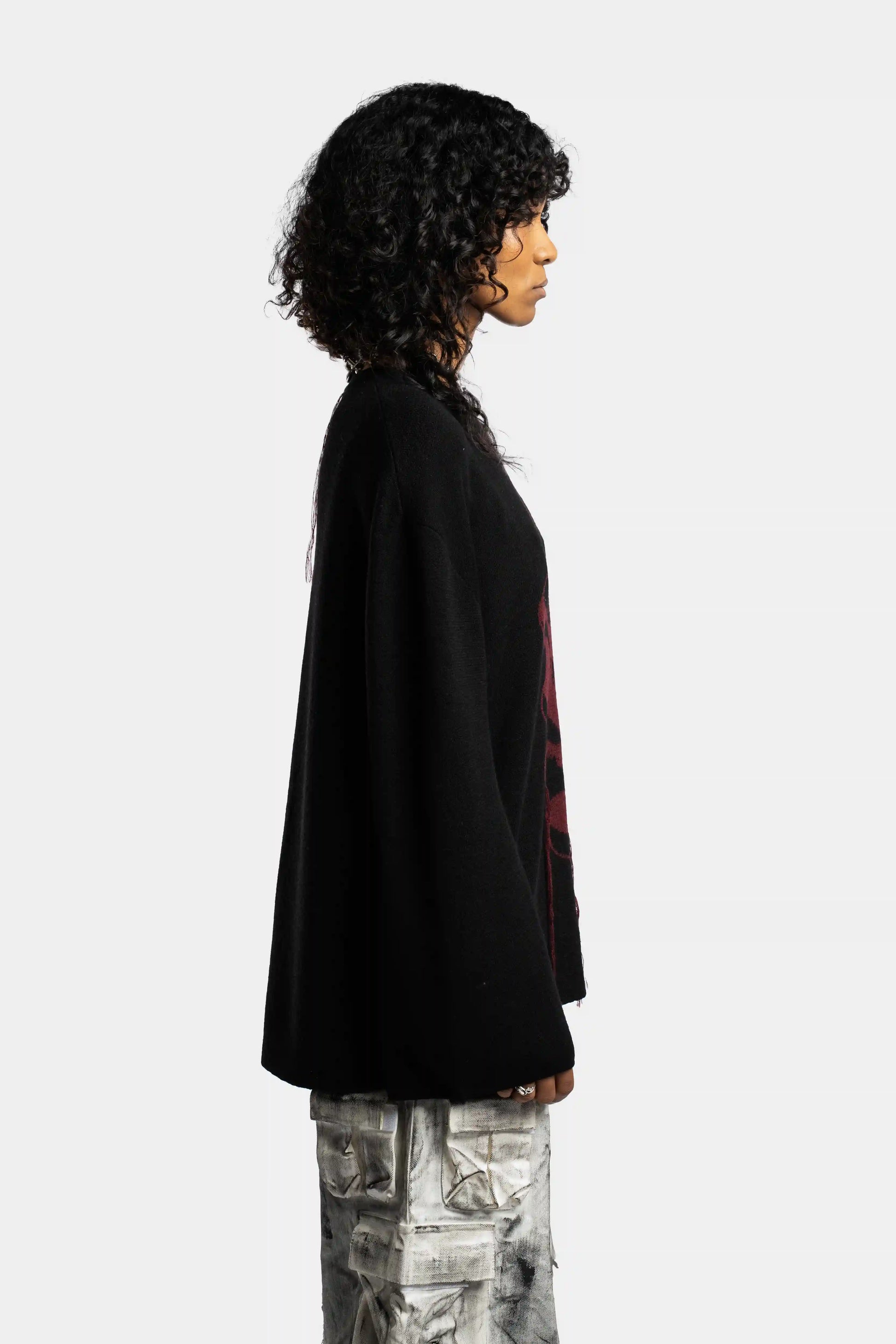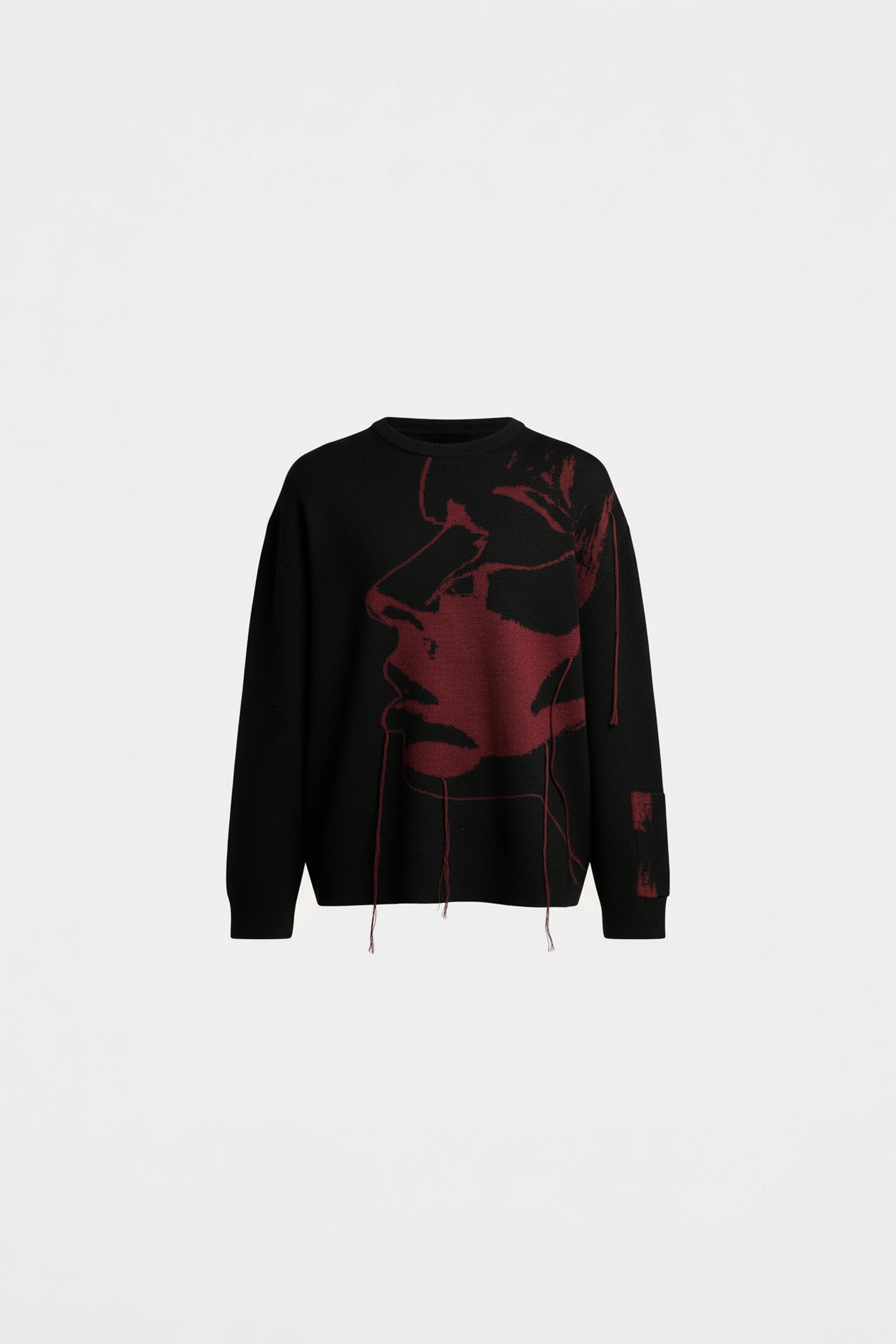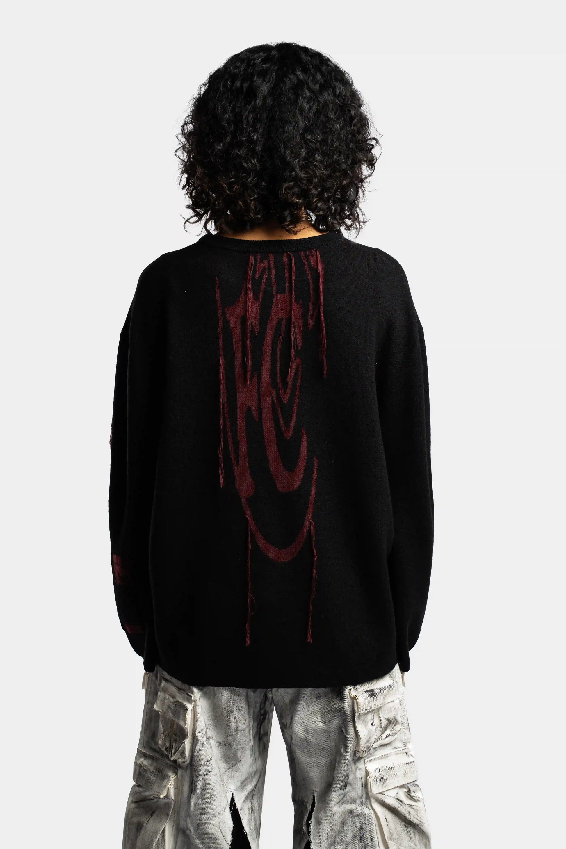 Oversized wool knit featuring distressed intarsia artwork and deconstructed surface threads.