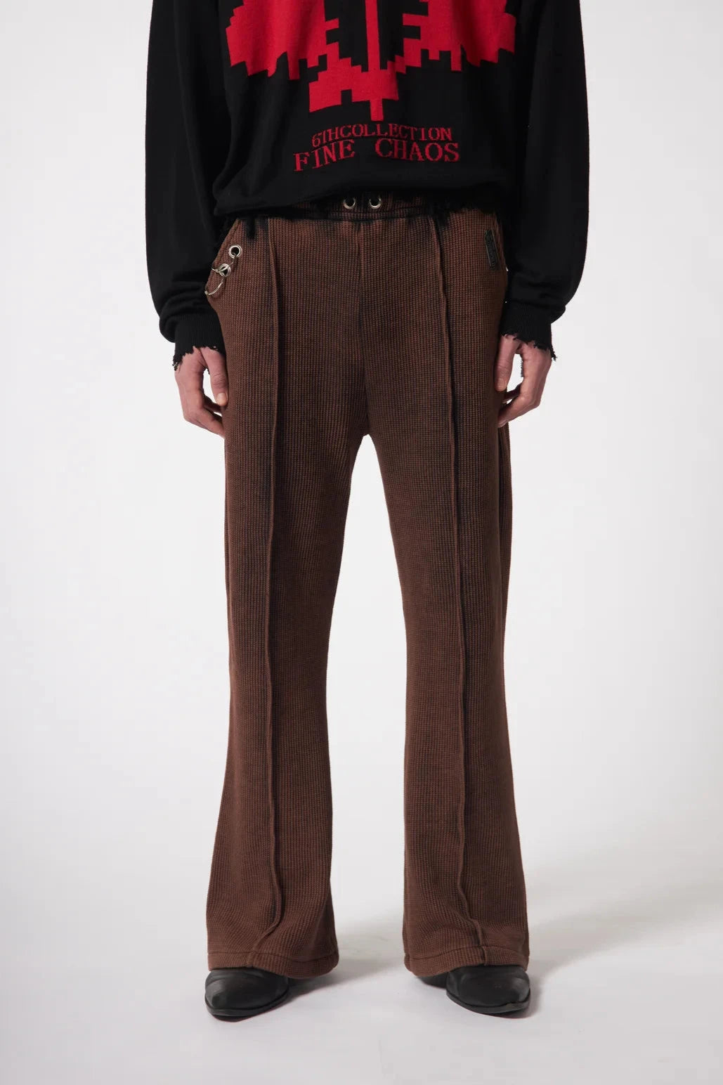 Brown trousers made from heavy organic cotton rib featuring metal details on each pocket.