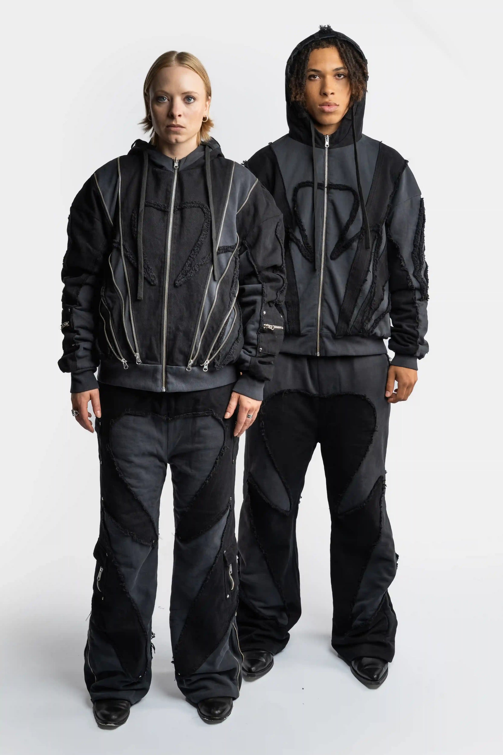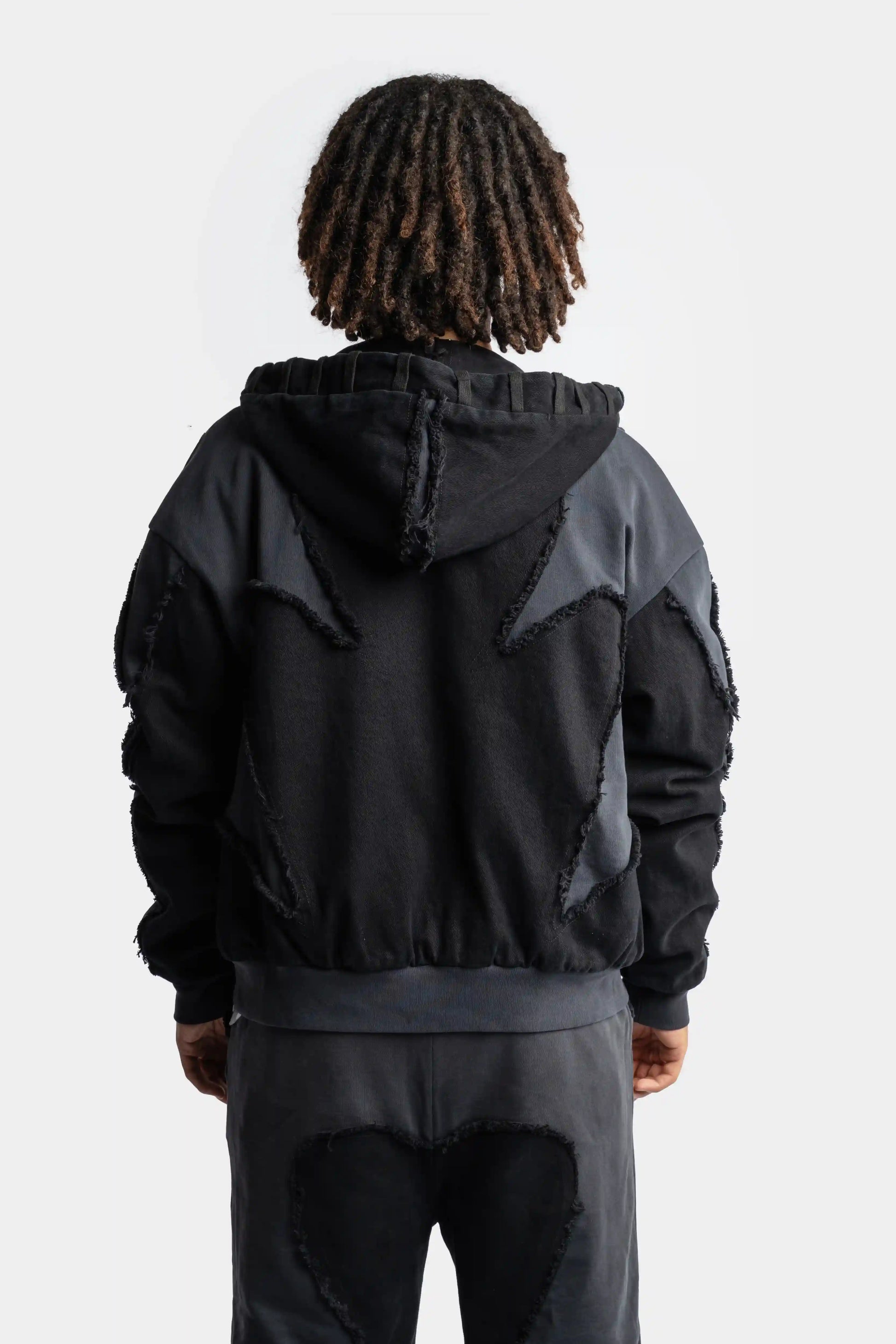Reversible hoodie combining heavy denim and French terry in a reversible construction.