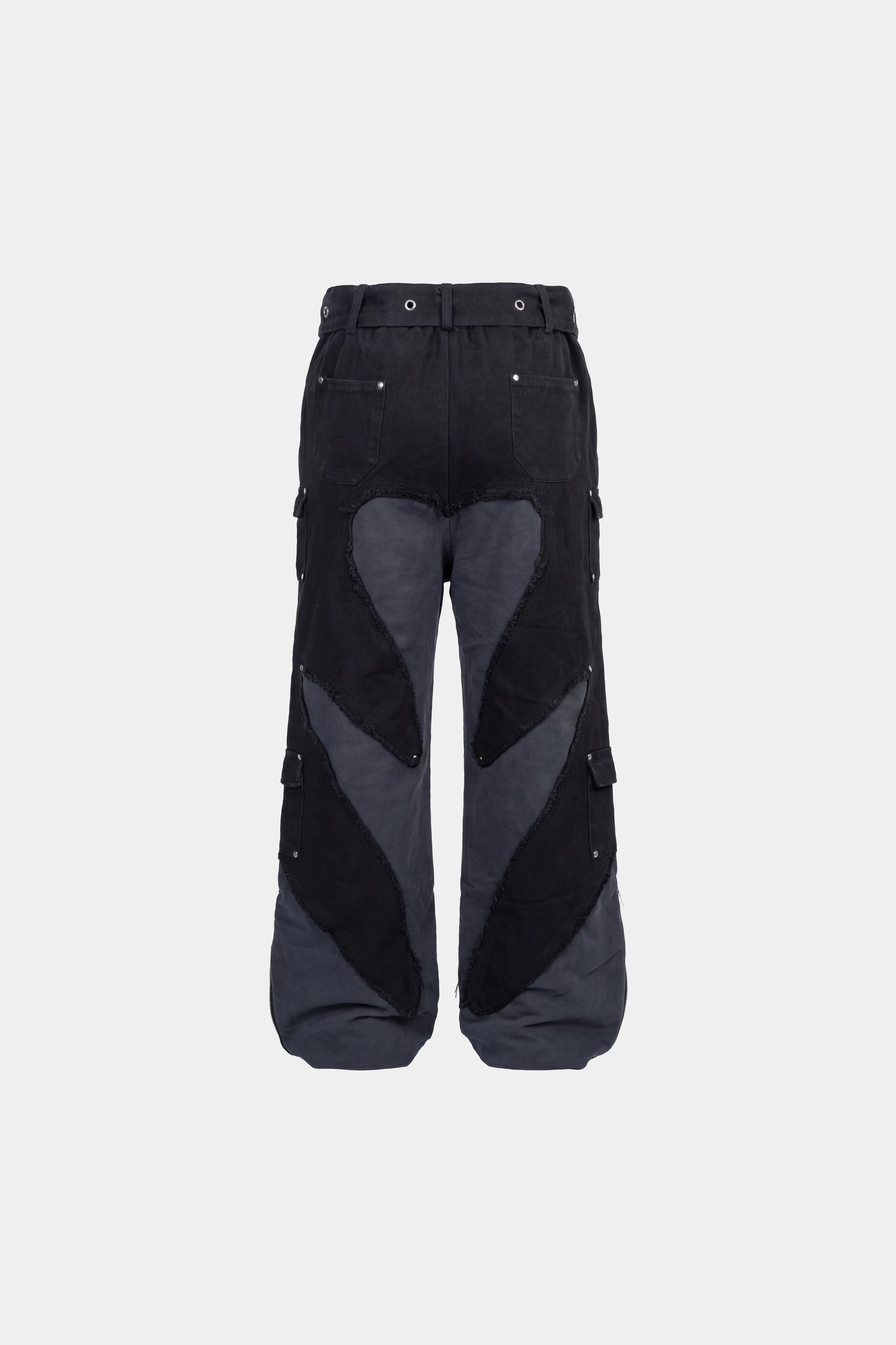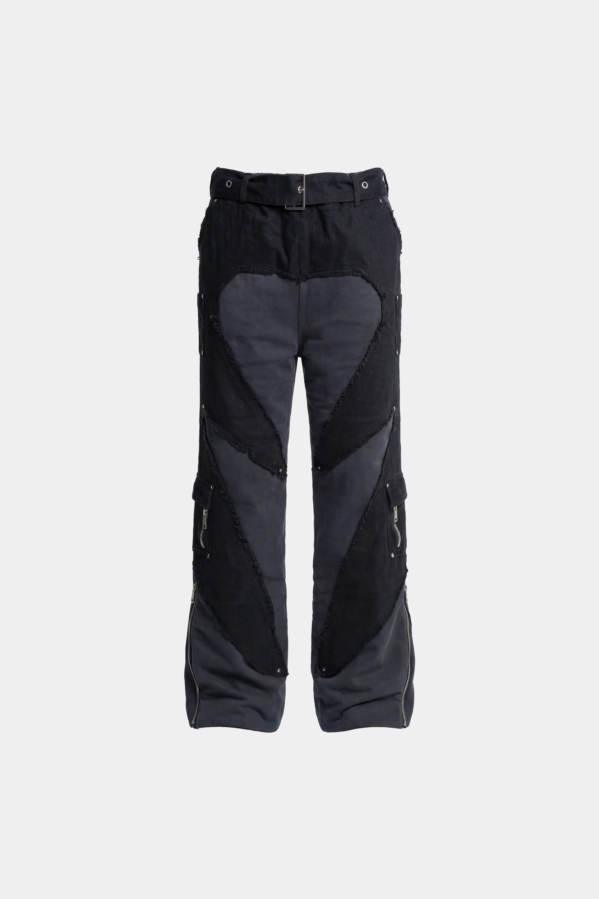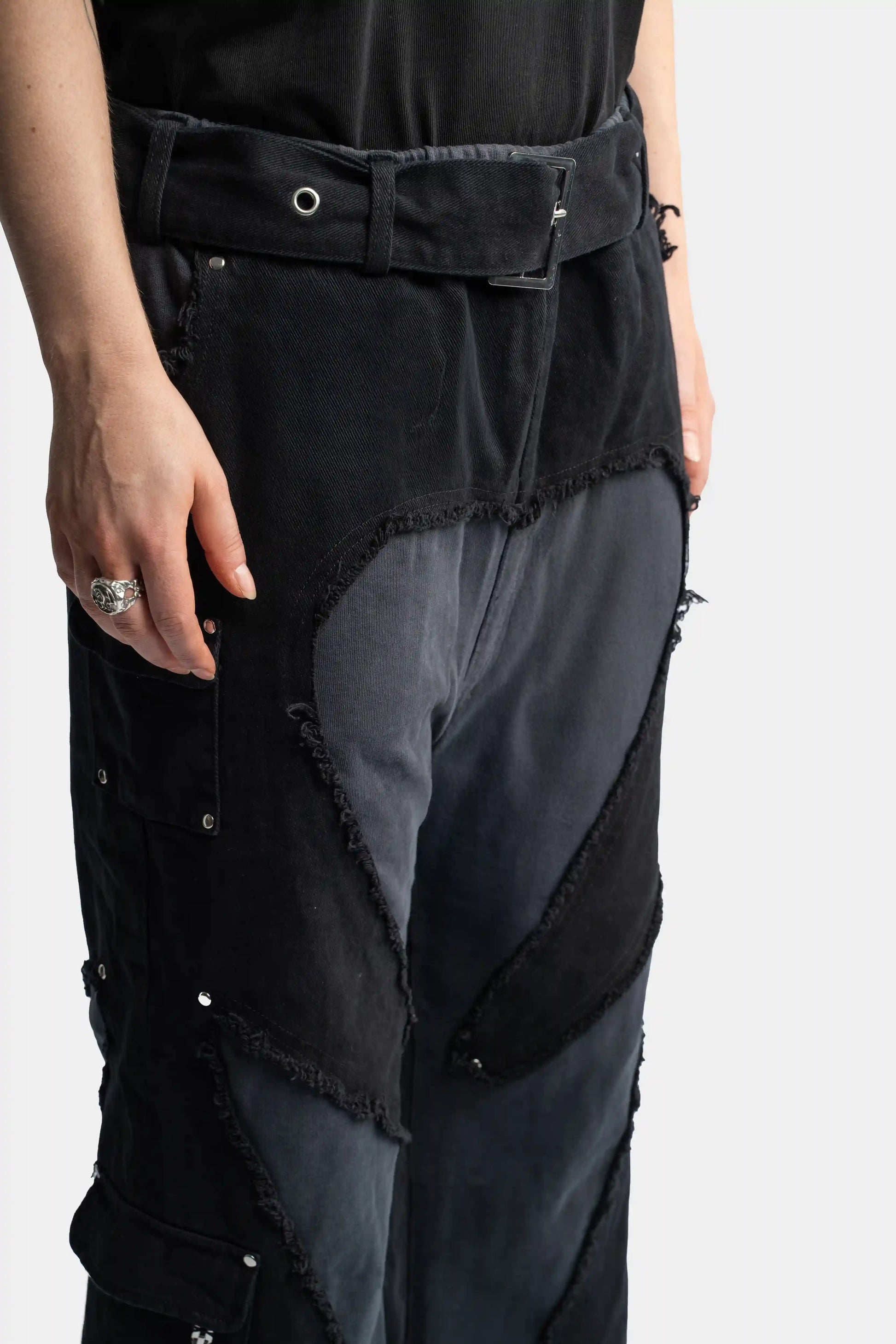 Reversible trousers made in heavy denim and cotton jersey, with added belt.