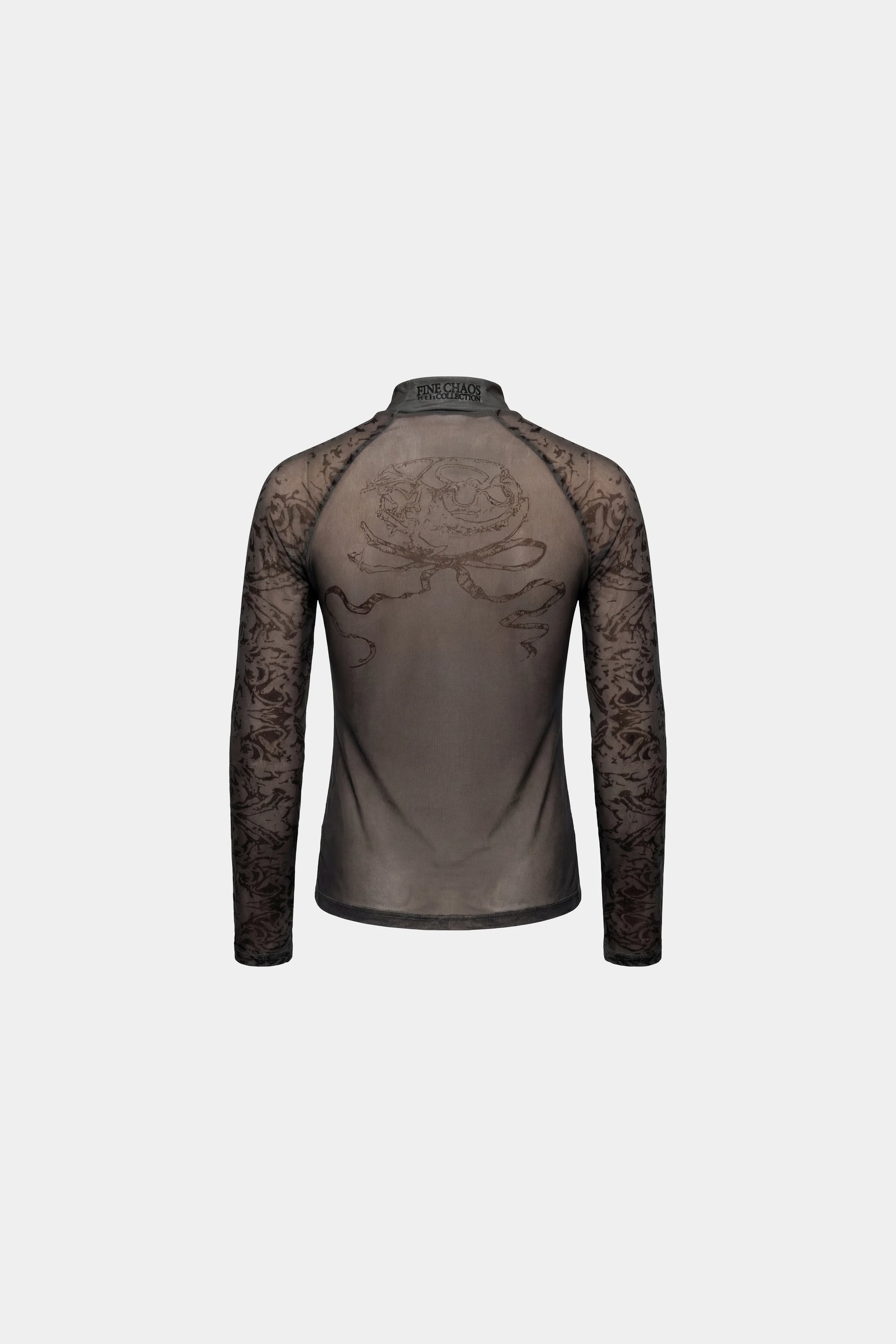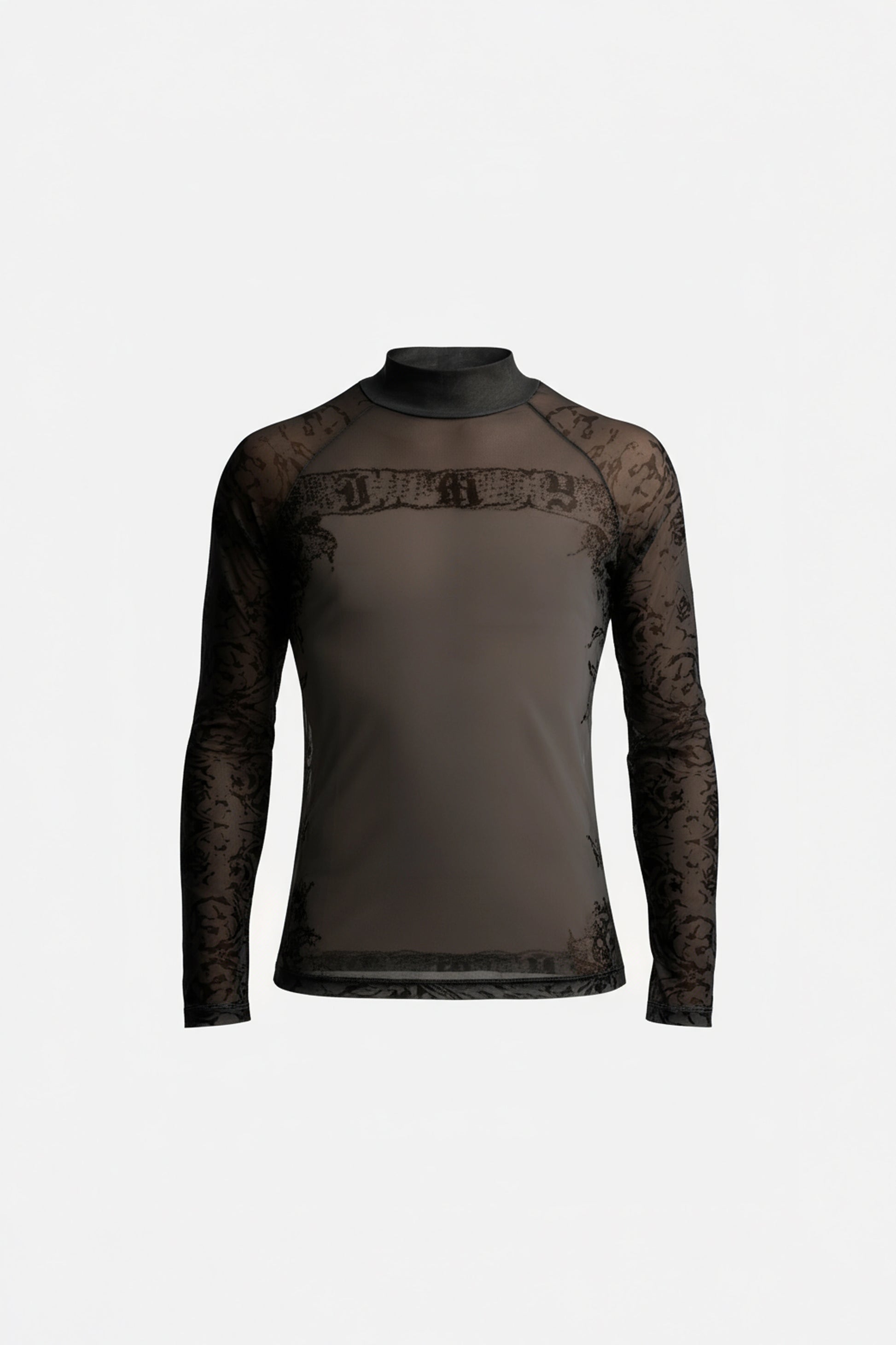 Long‑sleeved mesh top with all‑over Sword Art print by Thirty Nin.