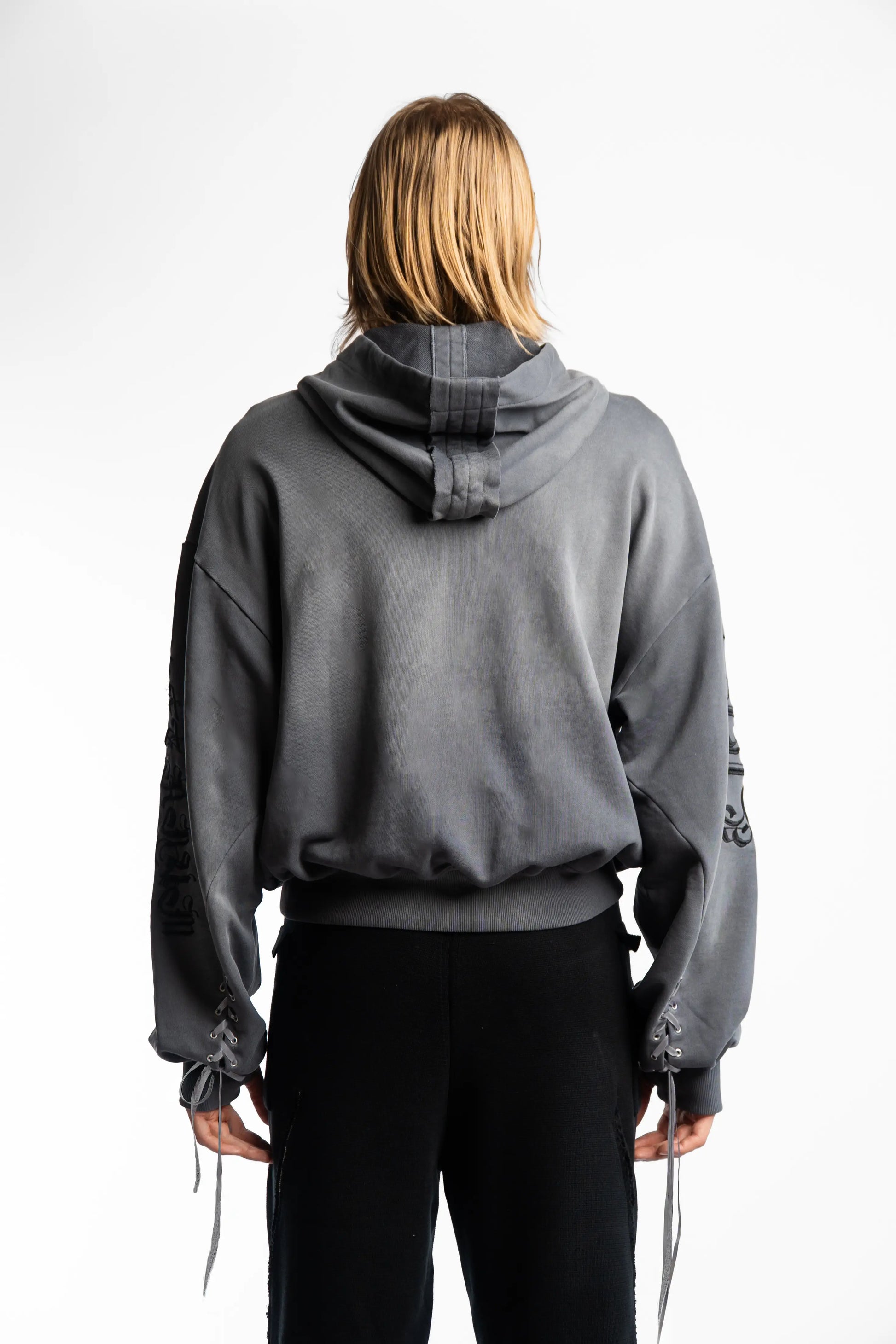 Heavyweight organic cotton hoodie in faded grey with ‘CHAOS’ embroidery and metal detailing.