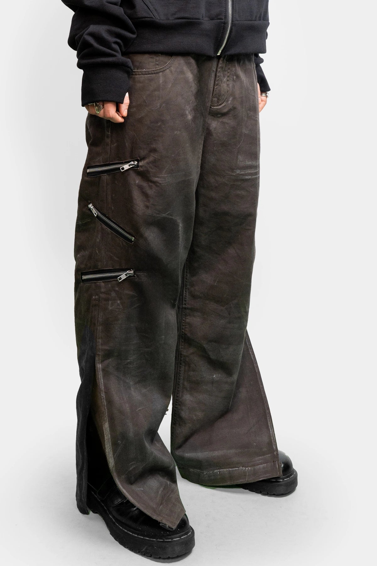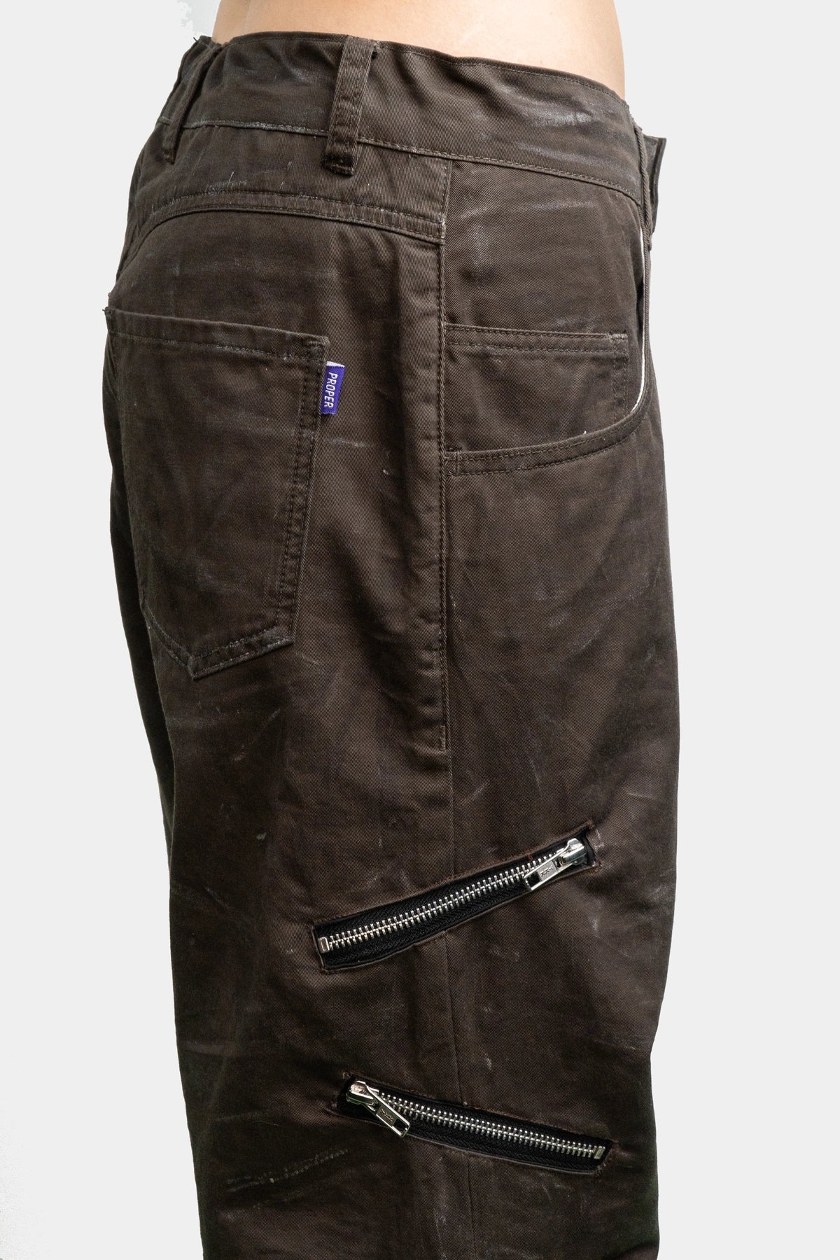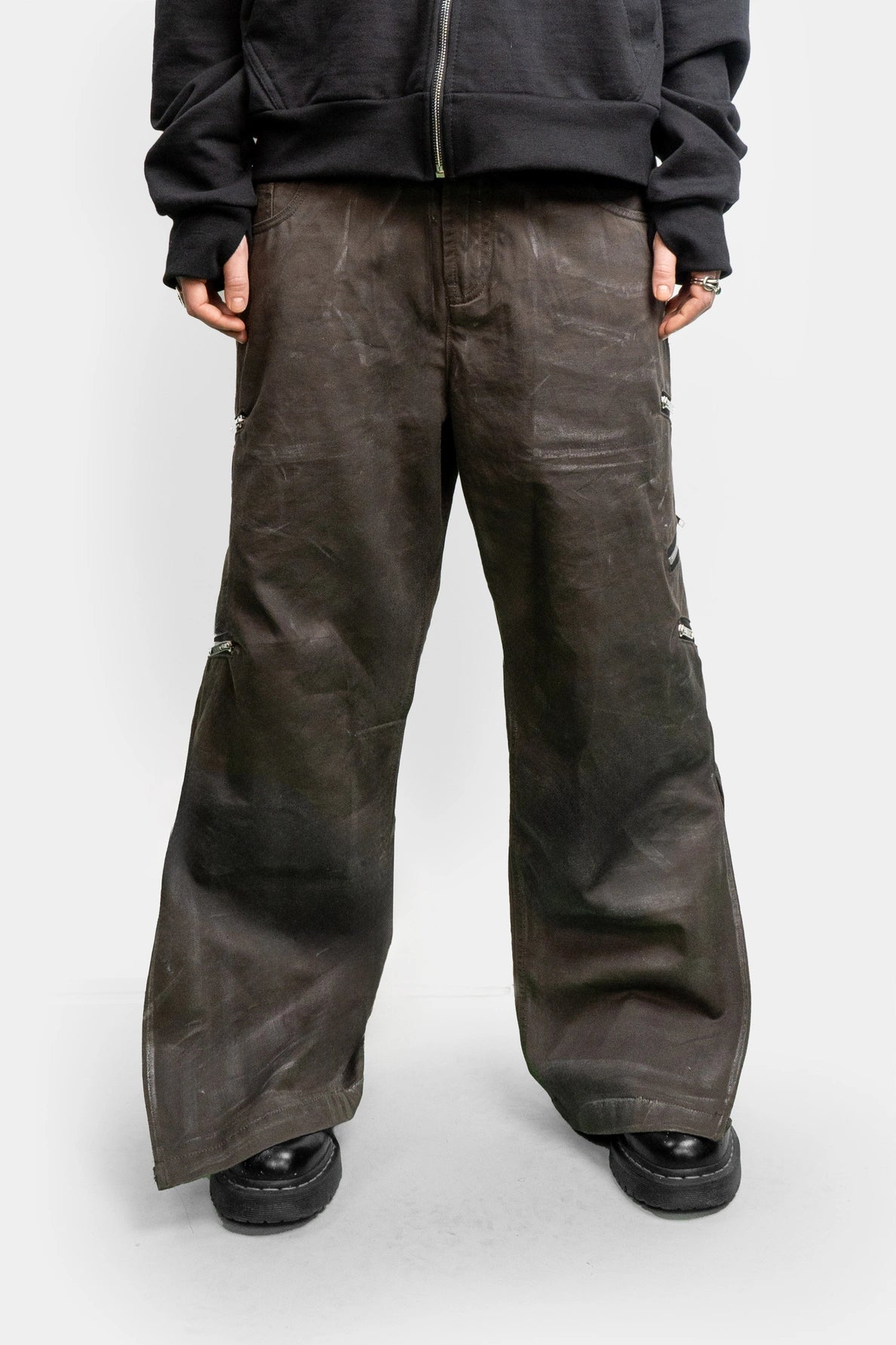 Polyester Zipper Trousers, treated with a hand-applied wax coating. Made in collaboration with Proper