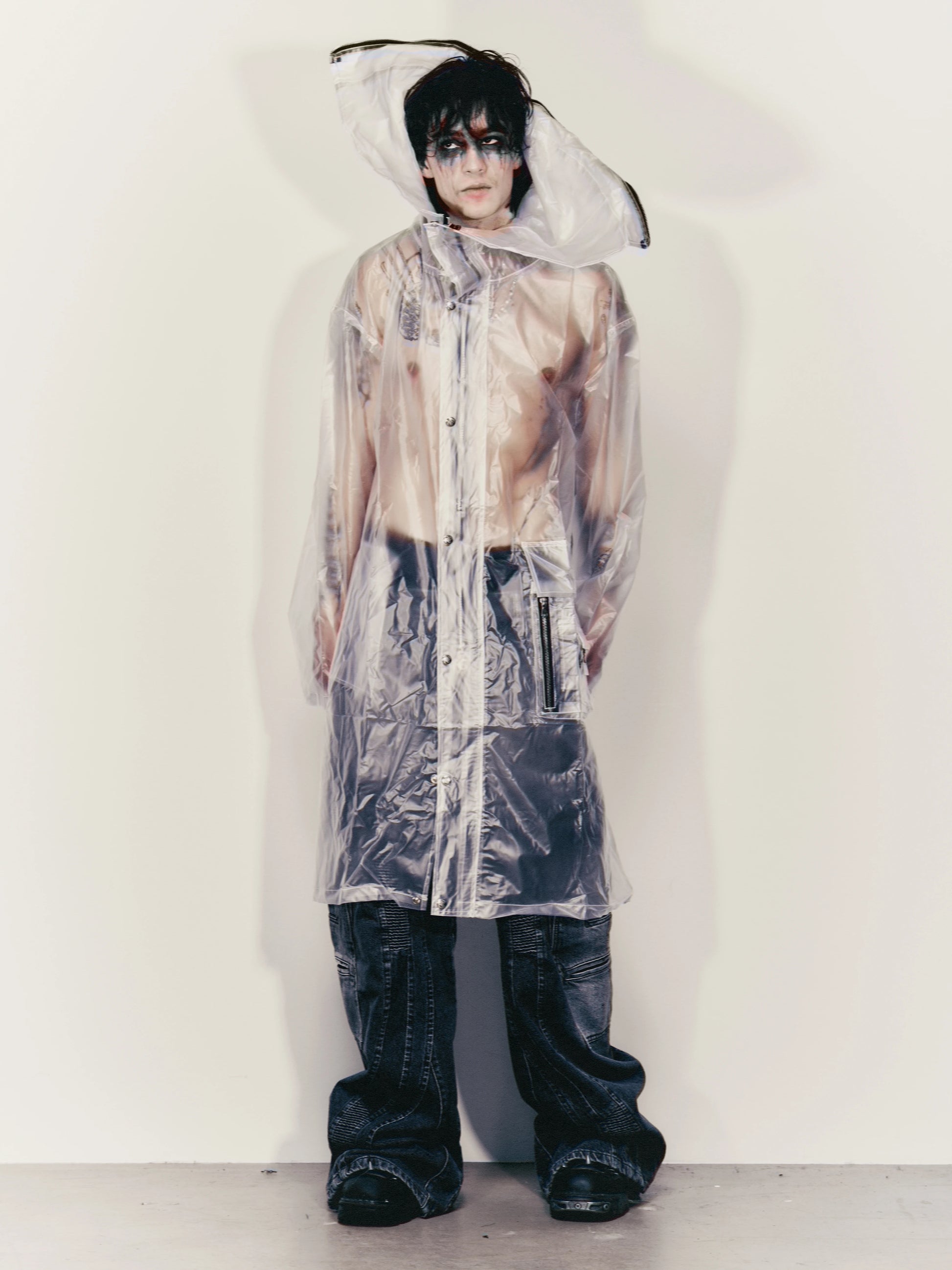 Long lightweight rain parka featuring a split hood construction and a back 'Ataraxis' artwork patch.