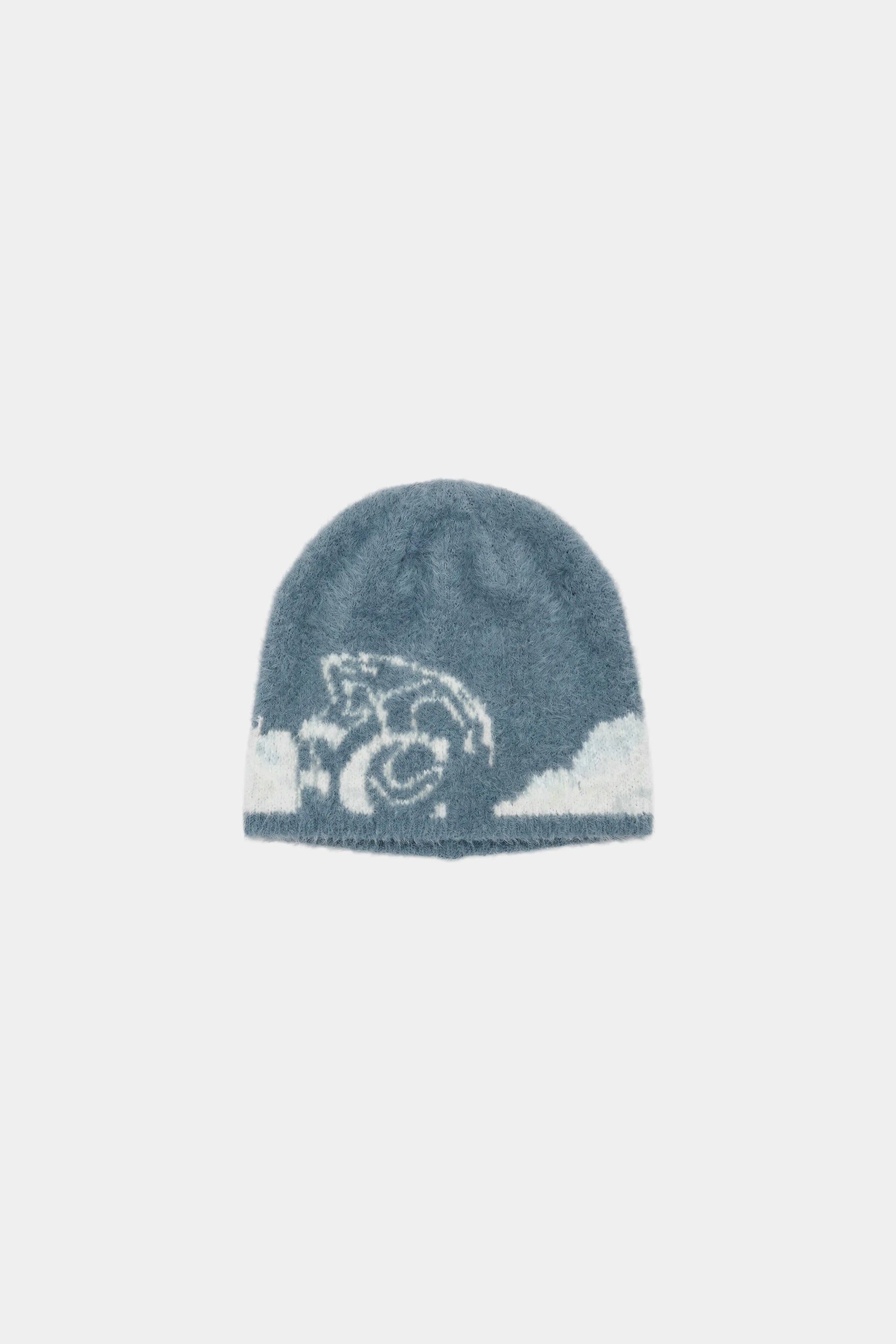 Fuzzy intarsia-knit beanie with FC-logo and cloud artwork.